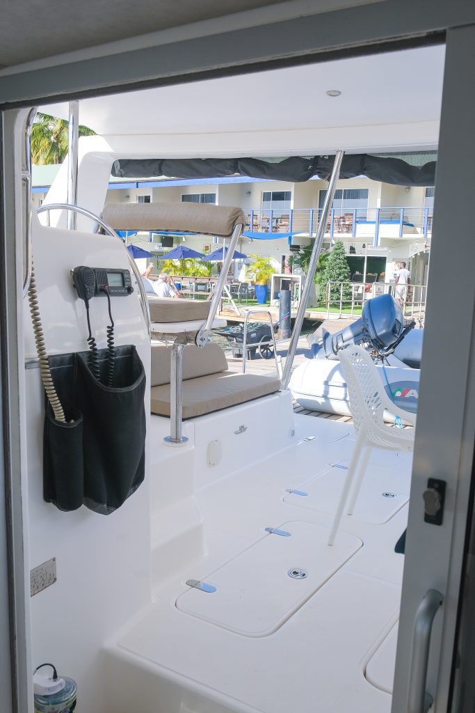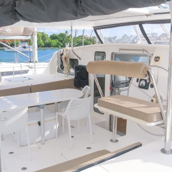 The large hard-top Bimini provides excellent shade in the cockpit. There are swim ladders at each sugar scoop as well as hot and cold showers.